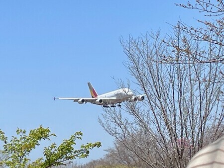 いきなり木立の向こうに降りてくる旅客機が見えてテンション爆上がりだったが、降りてくる飛行機は少なくてもっぱら上がっていく飛行機ばかり。